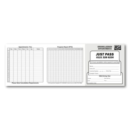 A durable card of approximately 297mm x 105mm which is then folded into thirds, resulting in a handy pocket-sized appointment card of 99mm x 105mm. Branded with the MSA logo and personalised with your School's details prominently displayed on the front cover in black.